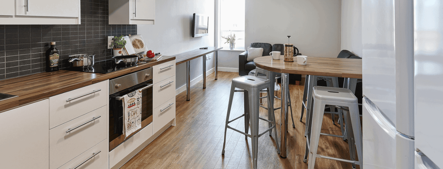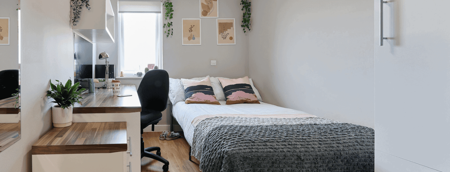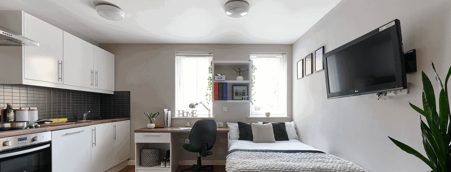 If you opt to live in either a 4, 5 or 6-bedroom flat with friends, you’ll each have your own private bedroom, study space and bathroom. But you’ll share the kitchen and living area. En-suite rooms come with a ¾ double bed and study area with a large desk and chair. If you’d prefer more space, studio rooms offer a large living and kitchen area. Rooms all have a very open feel, perfect for you to put your own style down in.
