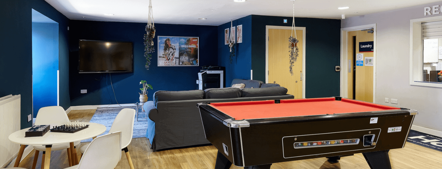 As you make your way through to the reception you will also find a large communal space. Relax, hang out and watch TV with friends, play games or challenge someone to pool.