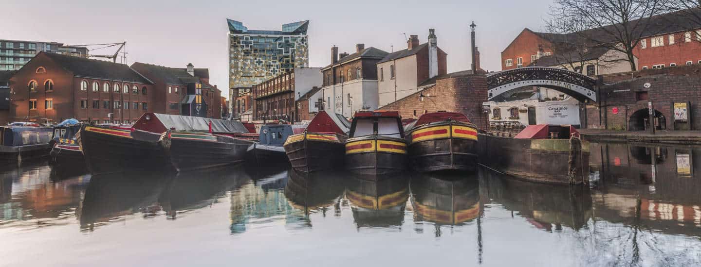 The heart of Birmingham’s canal network winds around restaurants, pubs and shopping outlets.